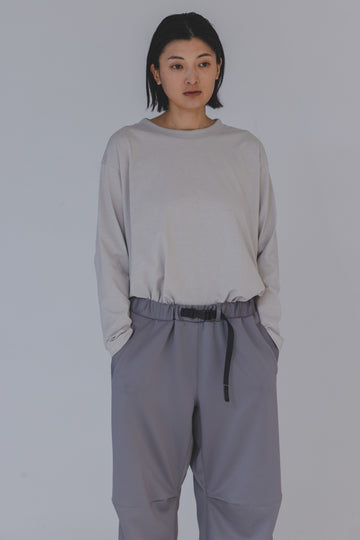 シルエットはややオーバーサイズで一見シンプルですが動きやすさを計算した立体パターンを取り入れ、脇下には同素材のリブ編みを仕込みさらに快適さをプラス。