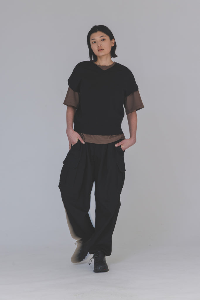 ベスト型で動きやすく前後どちらでも着られる設計で、インナーのデザインにマッチしやすい、見た目はシンプル、だけど中身はしっかりテックな1枚。